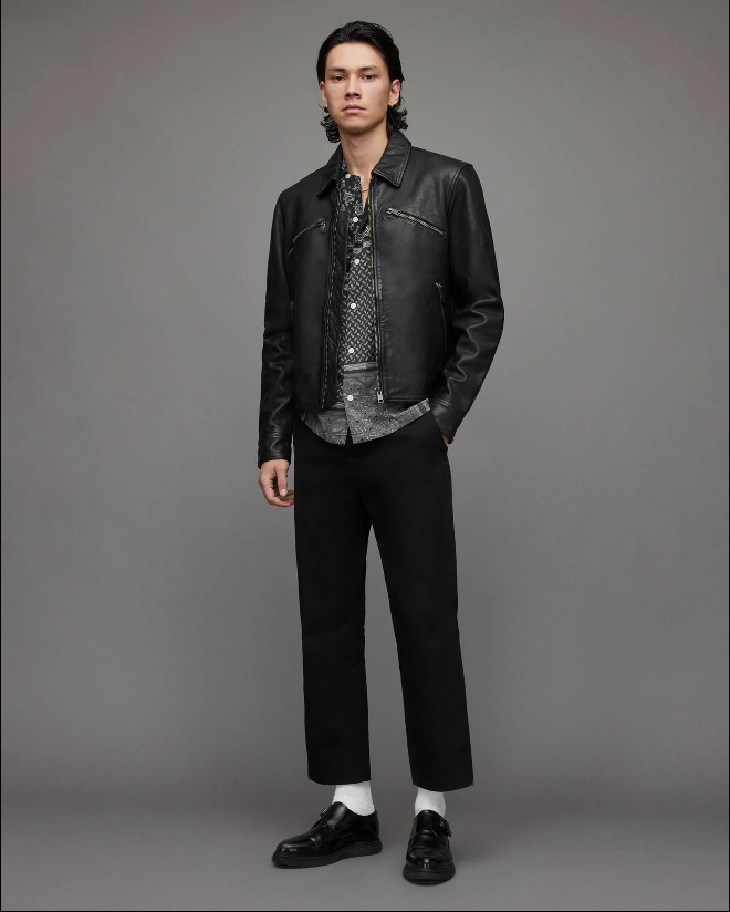Designed with a minimal, modern cut, this black leather jacket adds edge to jeans, boots, and even layered over hoodies. A reliable pick for your year-round wardrobe.