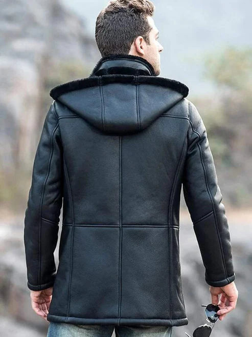 Men Sheepskin Fur Leather Coat with Hood - Warm Black Outerwear