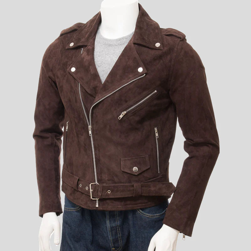 Mens Dark Chocolate Brown Suede Leather Biker Jacket - Rugged Look, Smooth Feel
