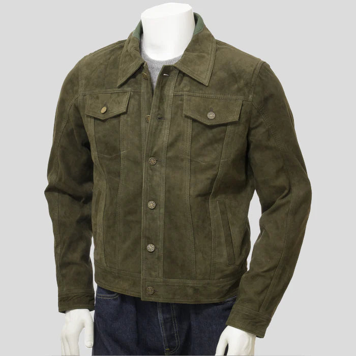 Mens Green Suede Leather Trucker Jacket - Stylish, Soft & Versatile