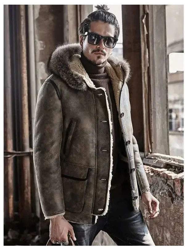 The men’s hooded shearling collar leather bomber jacket combines modern streetwear with classic bomber style. Designed for warmth and durability, this jacket is made from genuine leather and lined with soft shearling for all-day comfort.